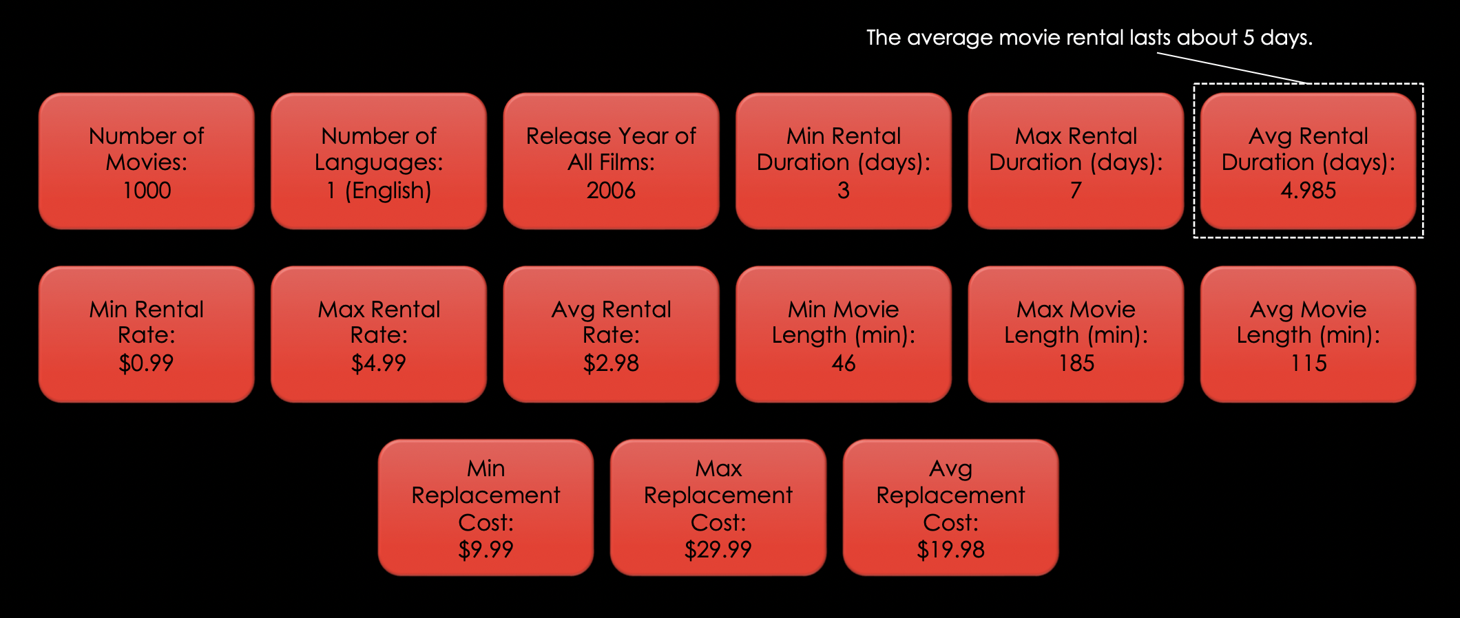 After cleaning the data, I ran several queries to summarize the data in the database. This data overview helped paint a quick picture of the current Rockbuster Stealth catalog. I highlighted key data points that were of significant interest namely the average rental length, and number of movies per rating.