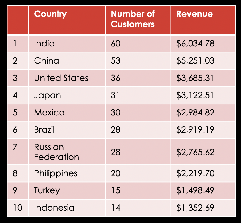 Understanding our customers is crucial when building the online catalog. Here, we can see where all Rockbuster customers are located and revenue by country.